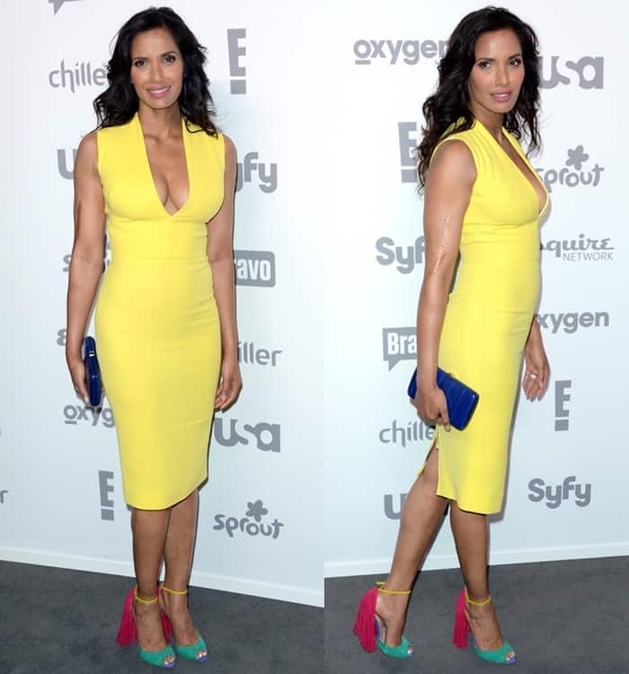 Padma Lakshmi flaunted her curves in a stunning, figure-hugging yellow dress with a plunging neckline at the 2015 NBC Universal Cable Entertainment Upfront in Manhattan, New York City, on May 14, 2015 (Credit: WENN)