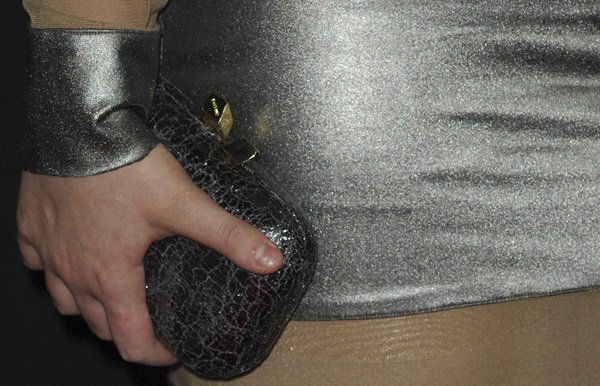The dress is from Norma Kamali’s Fall 2011 collection. While Abigail accessorized with a small metallic clutch and studded earrings, everyone focused on the sheer striped dress.