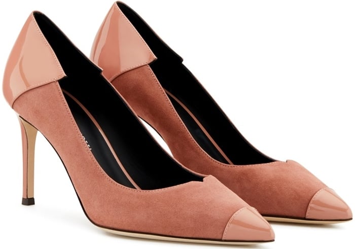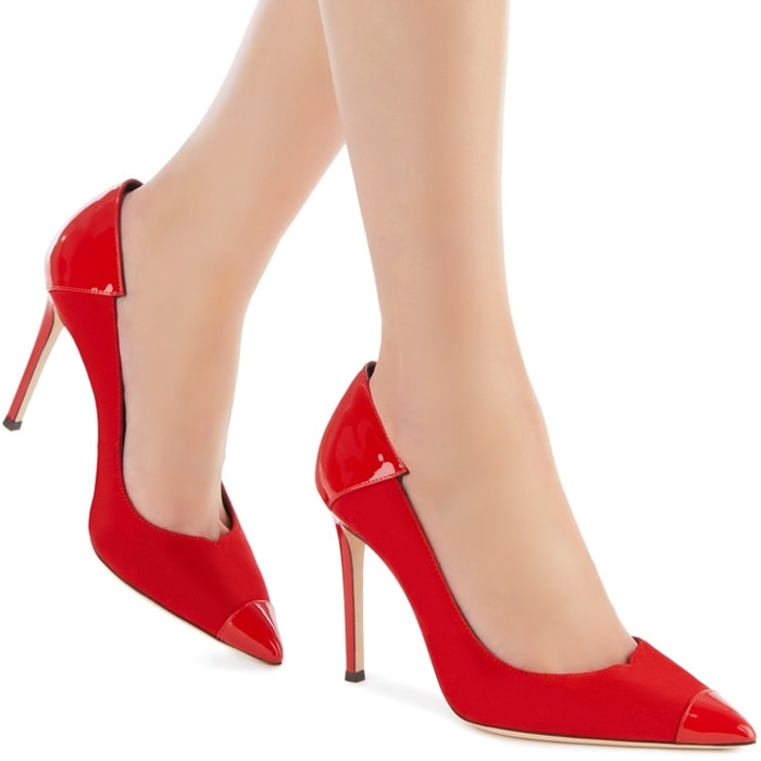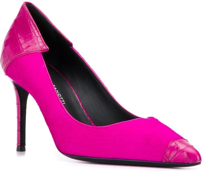 Characterized by the cocktail red suede patent insert on the front, they feature a pointed toe, a branded insole, black alligator print leather insert on the back, and a high stiletto heel.