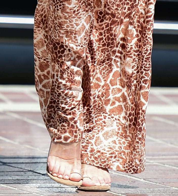 She then carried a brown leather bag over her shoulders and completed her look with a pair of toe-ring sandals. Her trendy heels feature a wide PVC strap, a toe ring, and a stiletto heel.