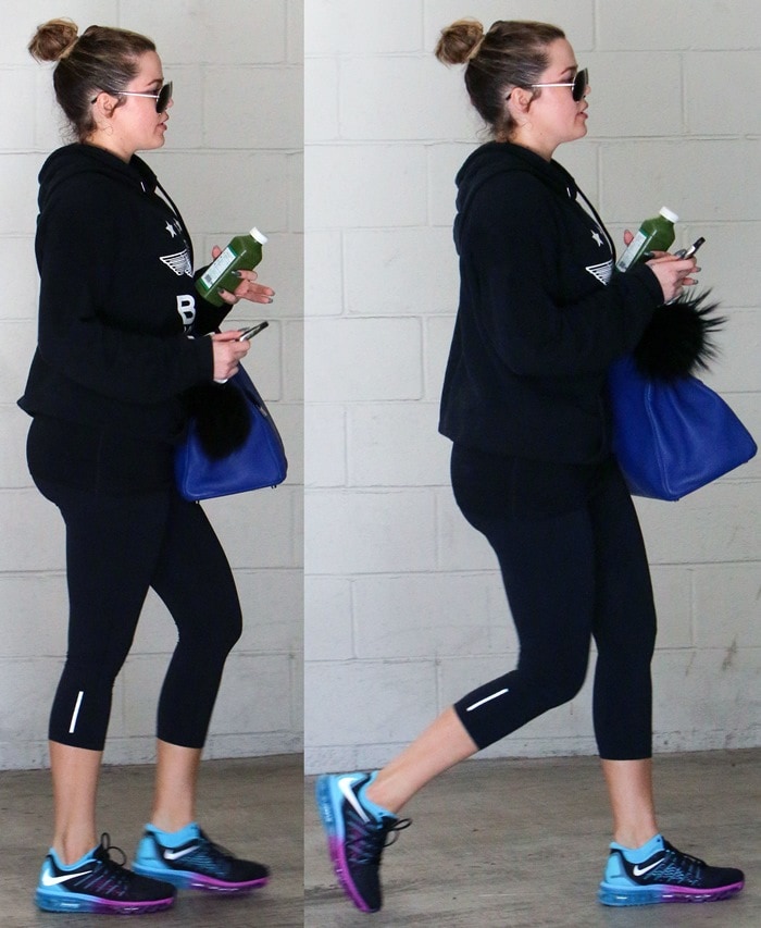 How do you like her cropped jacket and tight leggings? One month earlier, Khloé Kardashian wore the same shoes with a fashionable workout attire while leaving a gym in Beverly Hills.