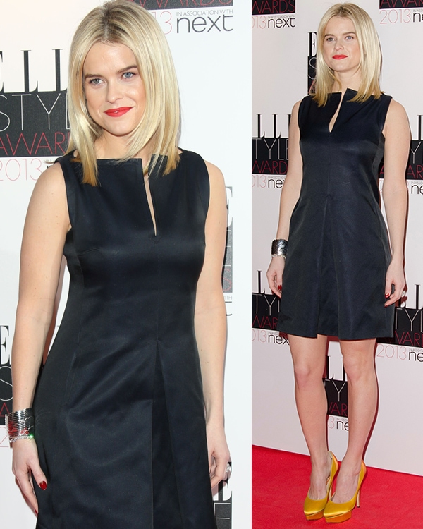 Alice Eve adds a pop of color to her classic black dress with bold yellow heels, making a stylish statement at the Elle Style Awards 2013 in London, England, on February 11, 2013 (Credit: WENN)