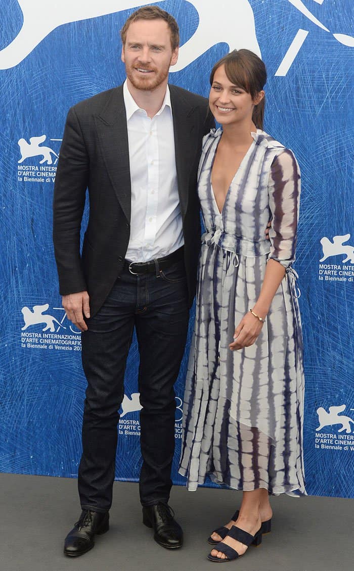 Alicia’s co-star and boyfriend, Michael Fassbender, joined her at the photocall of their movie, making their relationship red carpet official. He was handsome in a white shirt tucked into a pair of belted jeans. He also wore a blazer and completed his look with leather oxfords.