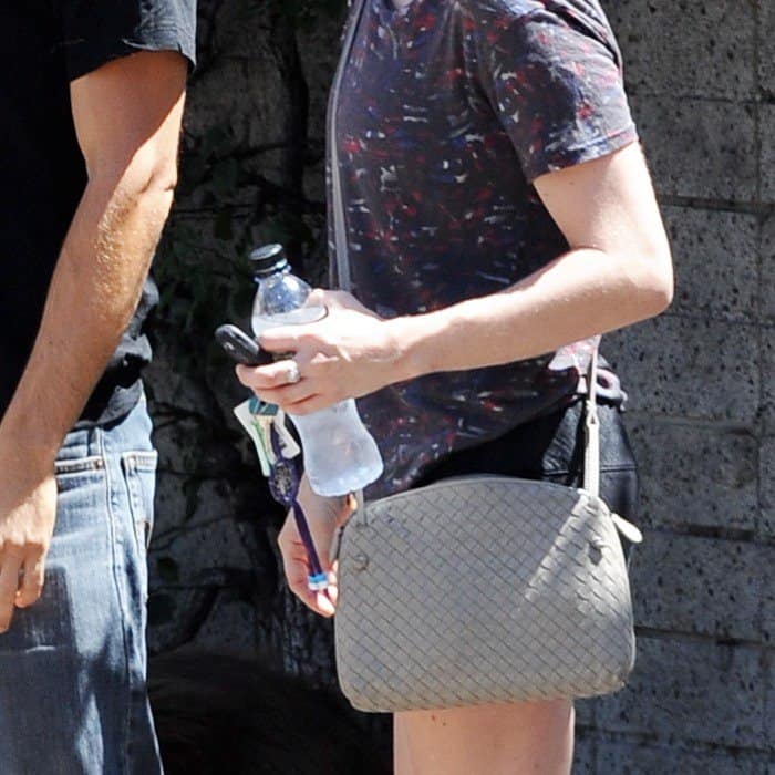 The ‘Lovelace’ actress wore a gray top, Nike shorts, and shoes. She finished off her off-duty look with a chic gray small crossbody bag from Bottega Veneta.
