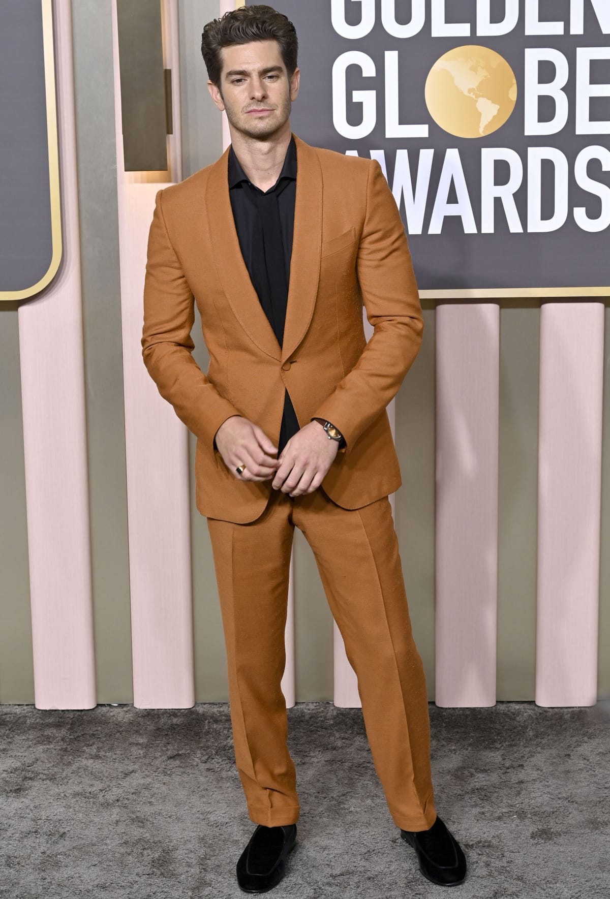 Standing tall at 5ft 10½ (179.1 cm) and wearing a US size 11 shoe, Andrew Garfield is often noticeably taller than his girlfriends—and just as attention-grabbing on the red carpet. Widely recognized for his bold, fashion-forward style, Garfield has moved beyond traditional black tuxedos to favor vibrant, tailored looks, often crafted with stylist Warren Alfie Baker.