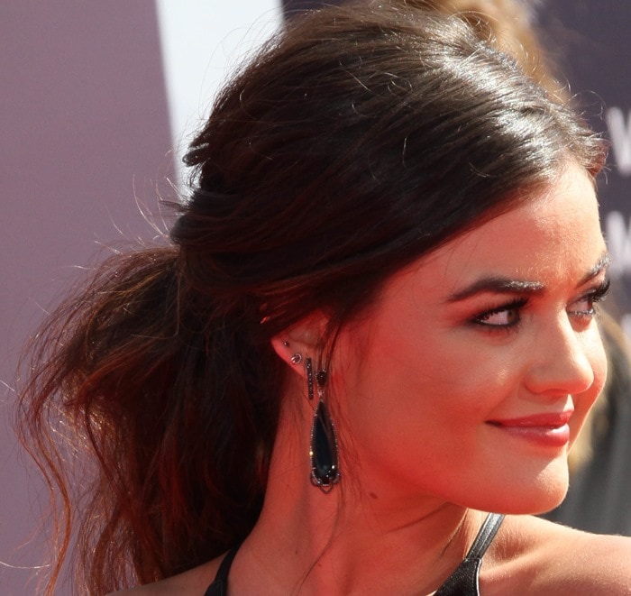 The 25-year-old ‘Pretty Little Liars’ actress co-hosted the preshow. While Lucy wore several different outfits, she arrived on the red carpet in a black leather-inspired halter top from the Sachin & Babi Spring 2014 collection. She styled it with a floral-printed full skirt by Zimmerman, earrings by Graziela Gems and EF Collection, and ankle-strap sandals by Stuart Weitzman. Kiernan Shipka wore the same style earlier this week, and we’ve also spotted the “Nudist” sandals on Chloë Grace Moretz, Kendall Jenner, Jordin Sparks, LeAnn Rimes, Blake Lively, and many more.