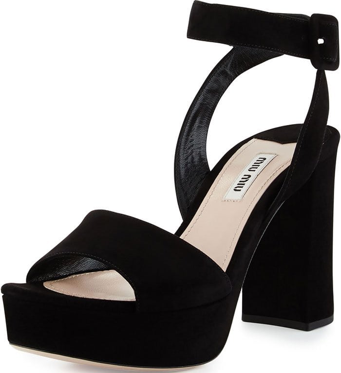 Black Miu Miu Suede Platform Ankle-Wrap SandalsBlack Miu Miu Suede Platform Ankle-Wrap Sandals, $690