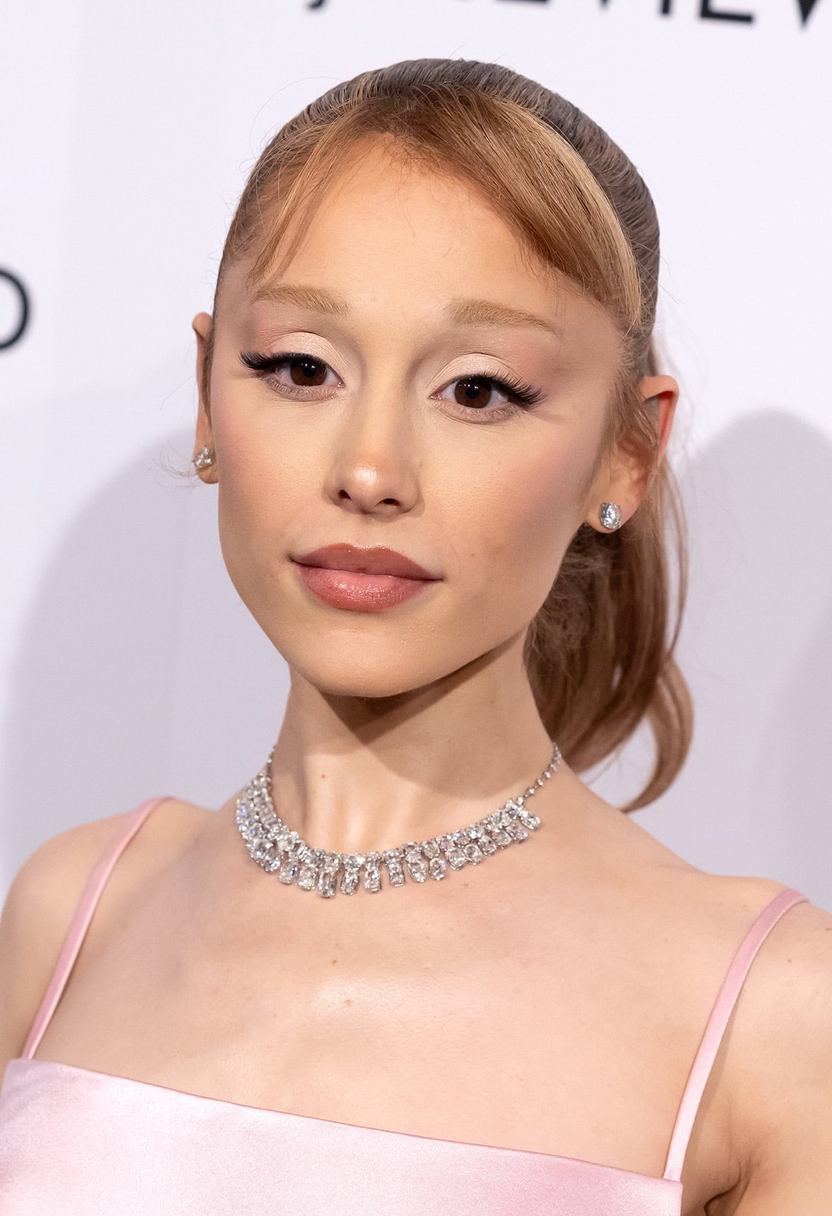 Ariana swept her Audrey Hepburn-inspired bangs to the side and pulled her tresses back in a high ponytail, allowing her diamond earrings to shine through.