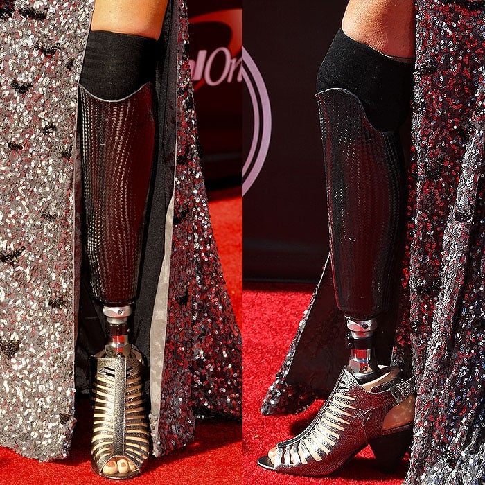 2014 Paralympic bronze medalist Amy Purdy said on her Twitter account that she was inspired by her prosthetic legs, and so she built her fembot look at the 2014 ESPY around them. A sequined Mac Duggal dress, steel-hued Vince Camuto cage sandals, and her metallic lower limbs made up her metal-on-metal-on-metal look. She even had this interesting anecdote about her outfit that night to share on Instagram: “Someone came up to me last night and said, ‘will you show my wife your cool boots!?’ And I was like, ‘you mean my legs?!’ LOL he thought I had knee high boots on!”