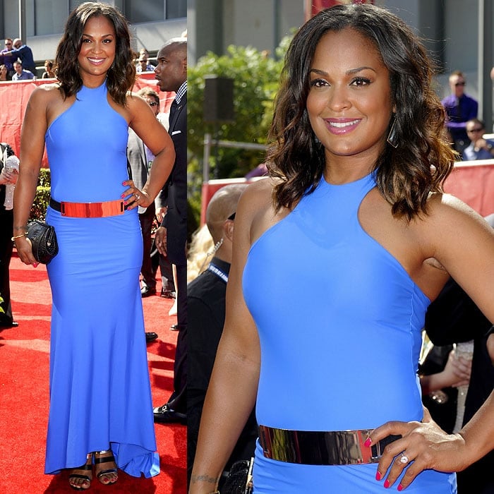 Laila Ali was a gladiator goddess in a blue Michael Costello halter dress cinched at the waist with a gold metal belt. Rounding out her look are the Jimmy Choo “Besso” sandals, which are the same shoes that landed her on our 8 Striking Shoes at the 2013 BET Awards list.