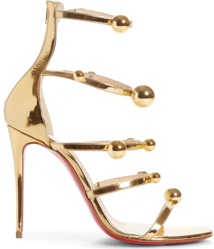 Tonal ball beads alight like perfectly rounded raindrops on the slim, laddered straps of a sky-high sandal lifted by a spiked stiletto. Christian Louboutin’s iconic red sole—born from a fateful brush with red nail lacquer—pops with every step you take. You can buy the ‘Atonana’ sandals in black, gold, and pompadour at Saks Fifth Avenue, Browns, Nordstrom, and Barneys New York.