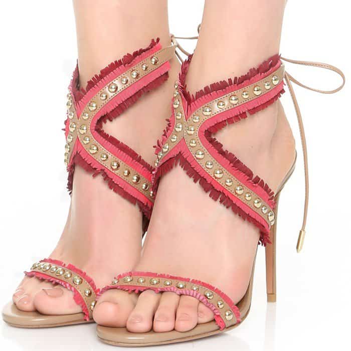 They feature boho-style burgundy and claret suede fringes, gold studs, wraparound ankle straps, and four-inch heels.