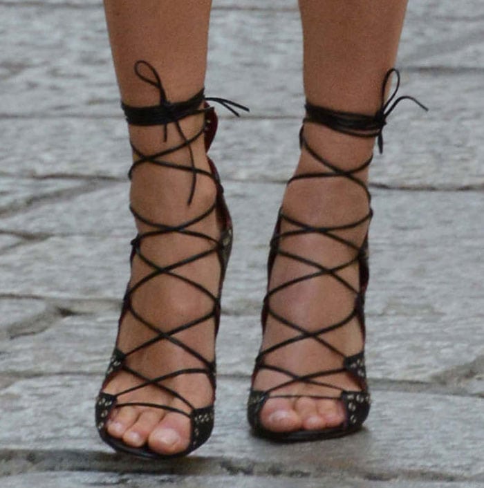 The 5′9″ host of The X Factor Israel elongated her slim pins with a strappy pair of “Lelie” sandals by Isabel Marant.