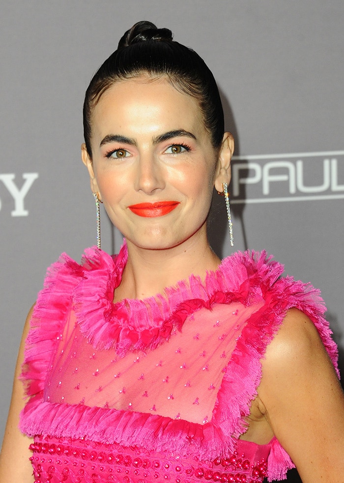 The Push actress pulled her black tresses up in a bun, wearing an orangey-red lip shade with complementing blush and eyeshadow.