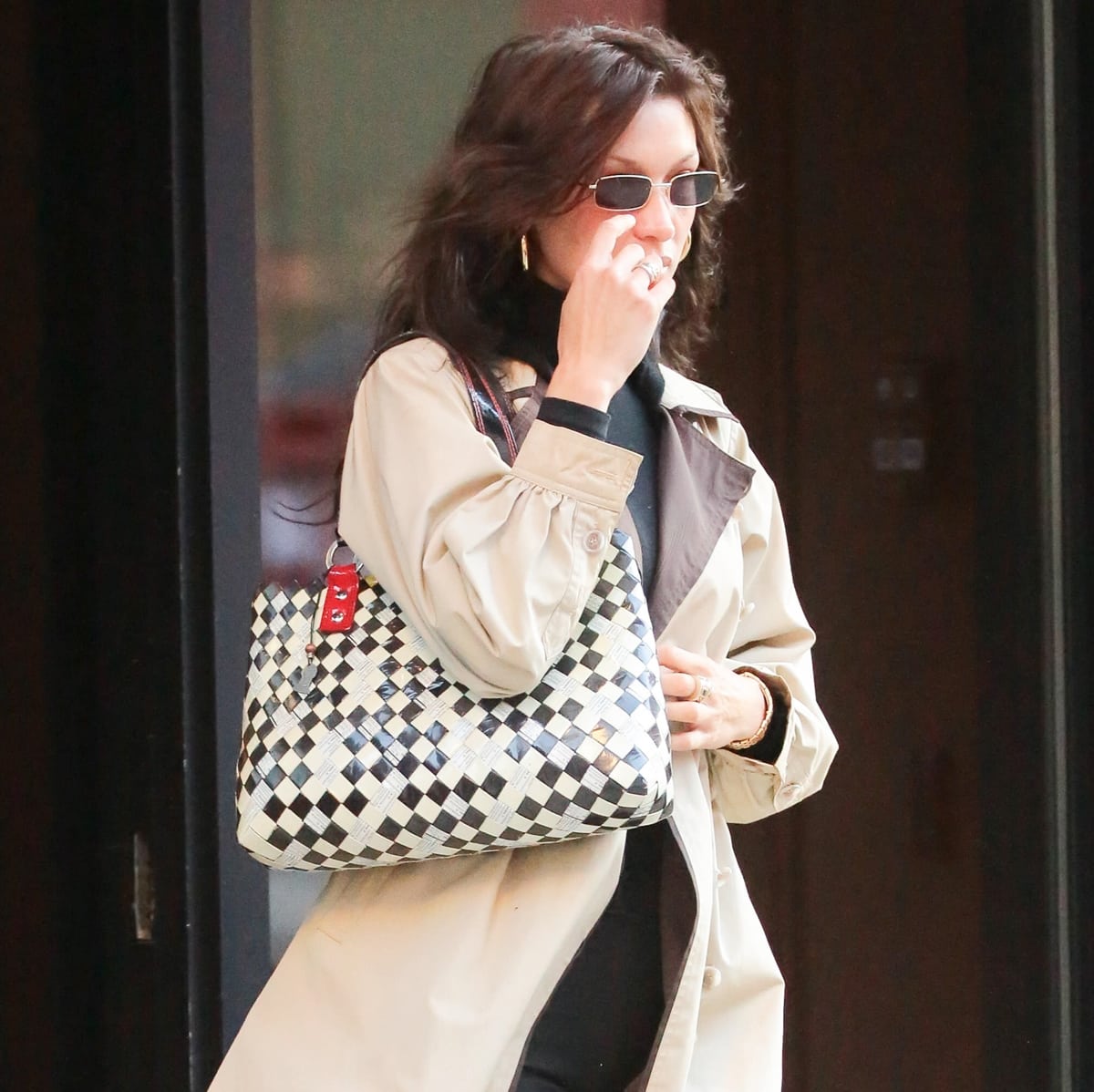 Adorned in a streamlined black turtleneck and wide-leg Susamusa Oring trousers to combat the chilly NYC weather, Bella introduced a touch of sophistication with a reversible trench coat featuring a two-toned lapel.