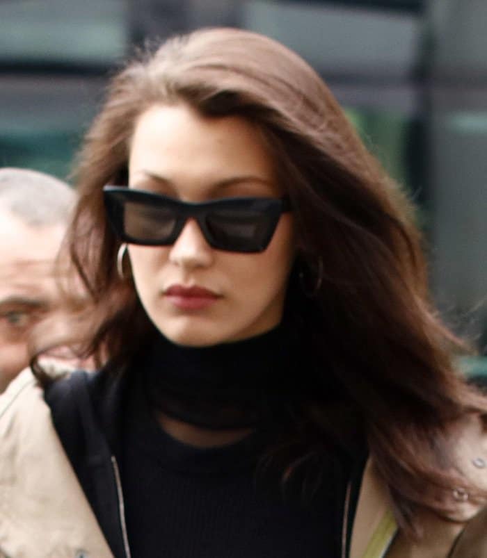 Gigi’s little sister kept her hair down and her makeup light, adding just a pop of color with a dark shade of lipstick. She hid her eyes behind oversized Celine sunglasses.