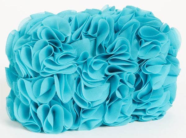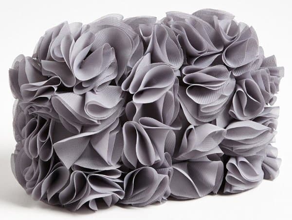 Her minaudière features ruffles all over, which effectively hide its clasp closure. It’s available in a wide variety of colors.