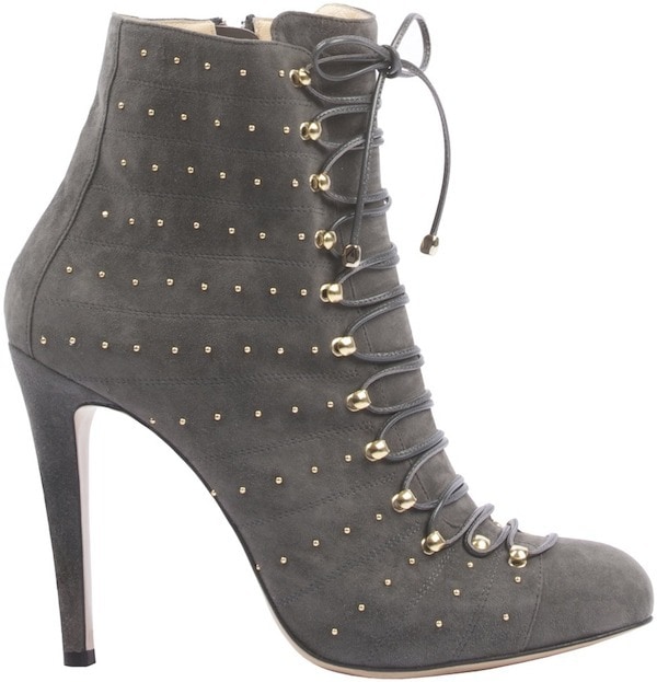 Bionda Castana’s “Roisin” lace-up ankle boots feature soft black suede, kidskin leather, almond toes, stiletto heels, leather laces, concealed inner zips, gold eyelets, and gold studs.