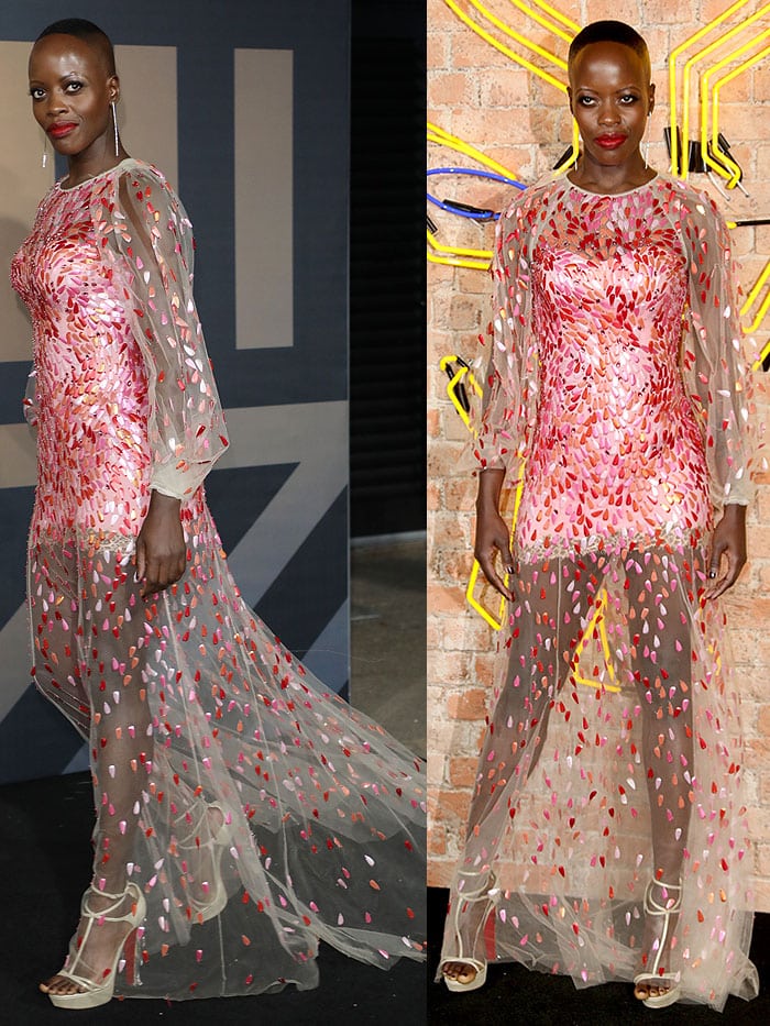 Florence Kasumba was a force to be reckoned with herself in a Jenny Packham Spring 2017 gown. While the German-Ugandan actress’s dress was more delicate in its sheer fabrication and candy-like pink-and-red embellishments, she still served a face as fierce as her other female co-stars.