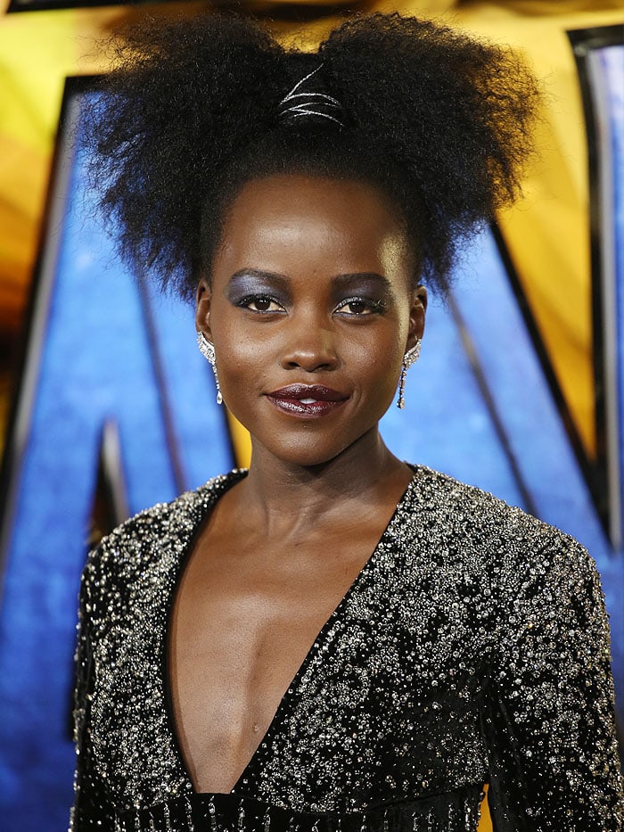 The Kenyan-Mexican actress added even more shine with De Beers “Phenomena Glacier” 10.44-carat diamond earrings, silvery eyeshadow, and a silver string tied around the center knot in her hair.
