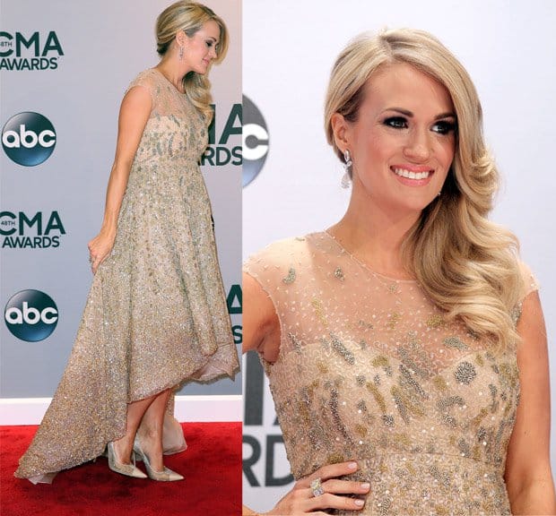 Singer Carrie Underwood in a cream-colored Lorena Sarbu dress featuring embroidery, a high-low hem, a sweetheart neckline, and a sheer overlay at the 48th annual CMA Awards at the Bridgestone Arena on November 5, 2014, in Nashville, Tennessee (Credit: WENN)