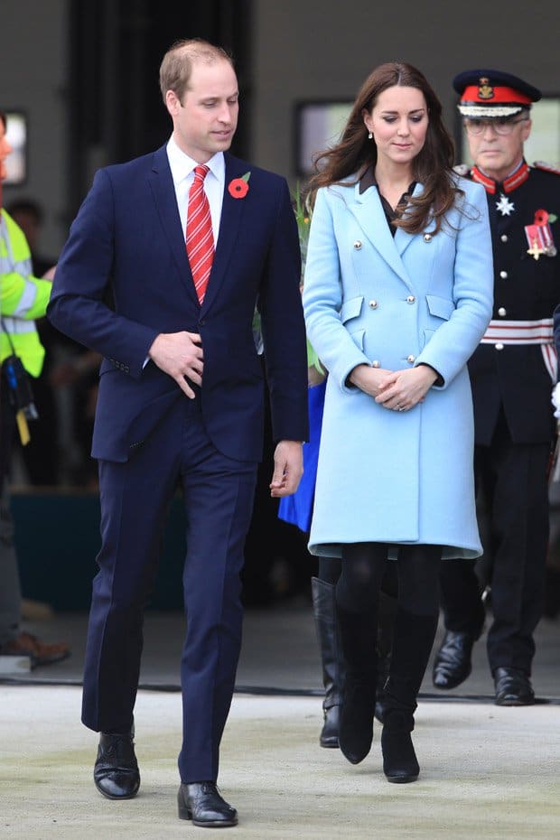 The Duchess of Cambridge is already in her second pregnancy but still hasn’t lost her stylish touch. She hid her growing bump in a blue dress coat by Matthew Williamson.