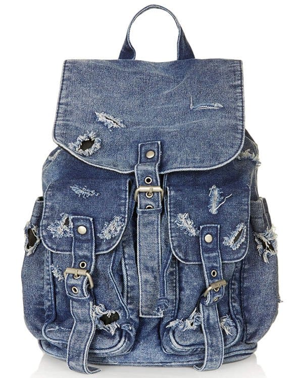 It’s a cotton denim backpack from Topshop featuring a ripped effect, flap closures, and buckled straps.