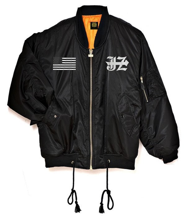 The jacket features a flag on the right chest and “JZ” on the left. At the back is another text that reads “PICASSO BABY” with a large “73” in the middle.