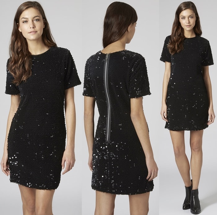 The 33-year-old singer, who was just named the highest-paid woman in the music industry after making $115 million in 2014, sported a $130 sequined short-sleeve body-con dress by the high-street chain Topshop.