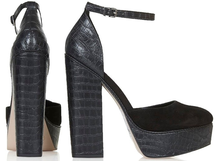 She styled the mini dress with a pair of black “Sheila” suede-effect, snake platform shoes from the same brand.