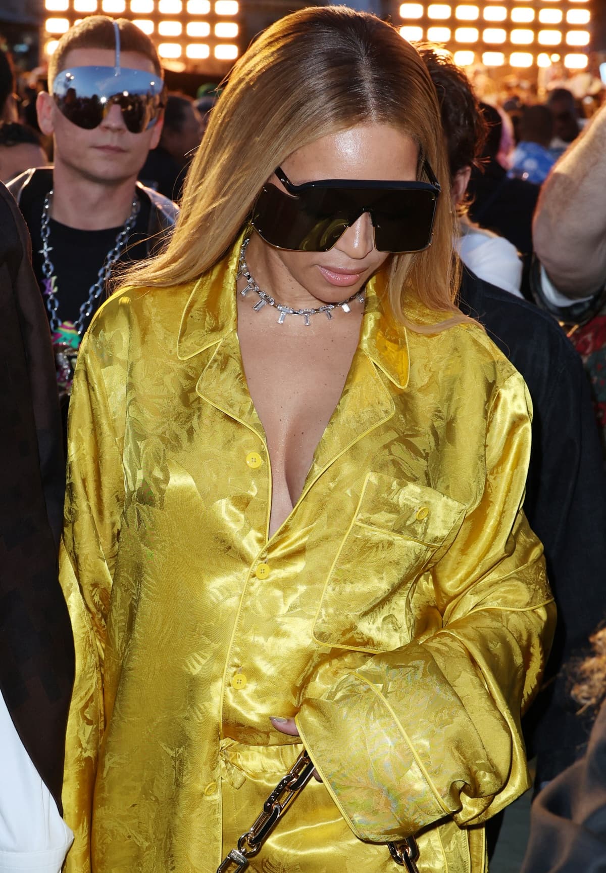 Styled by KJ Moody, Beyoncé added her signature flair, amplifying her already show-stopping outfit with oversized brown-toned shield sunglasses, a massive diamond choker necklace, and Tiffany & Co. Schlumberger ring.