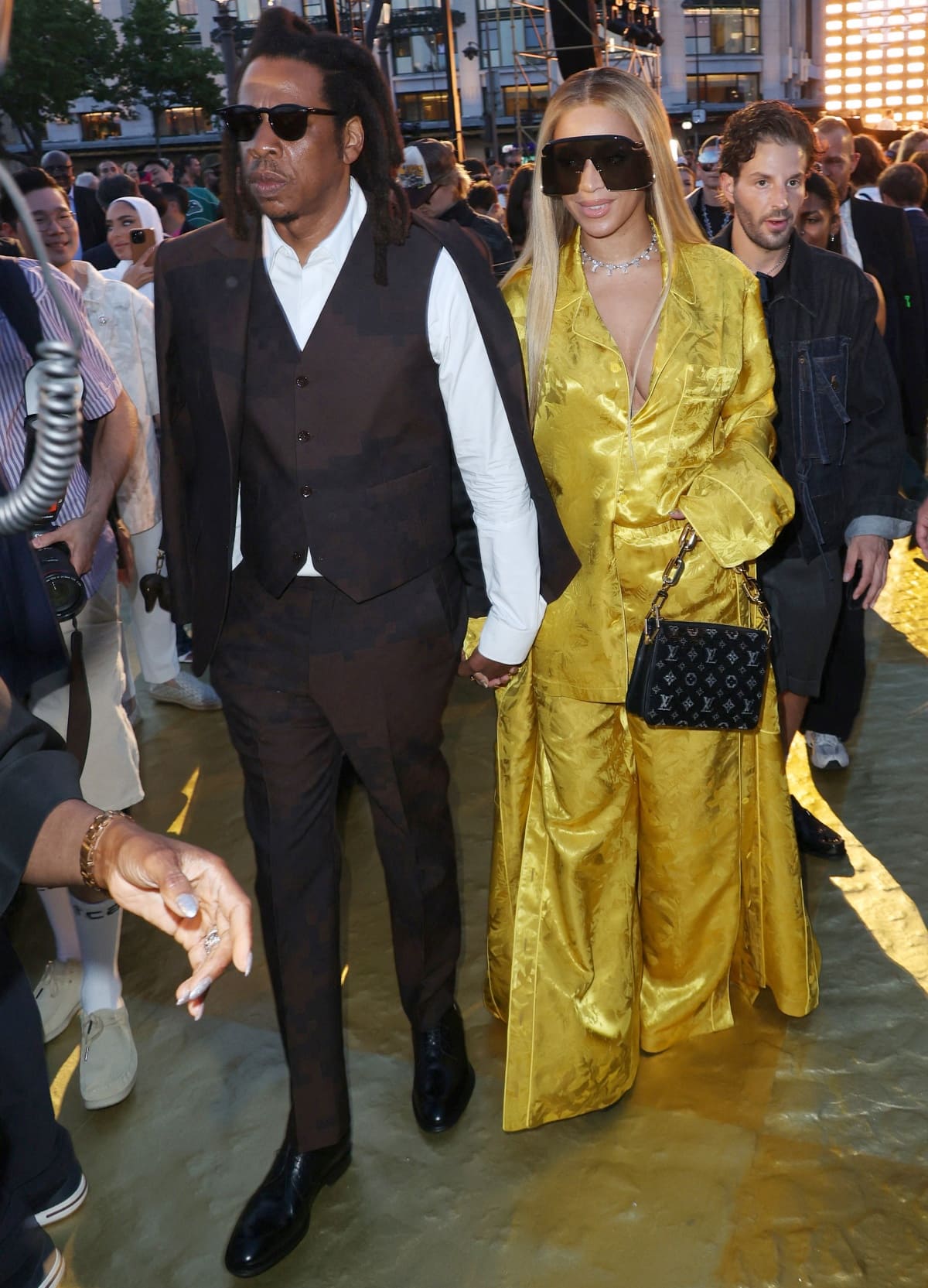 Jay-Z and Beyonce looking every bit the power couple in their custom Louis Vuitton outfits at the Louis Vuitton Menswear Spring/Summer 2024 show during Paris Fashion Week in Paris, France on June 20, 2023 (Credit: Abaca Press / INSTARimages)