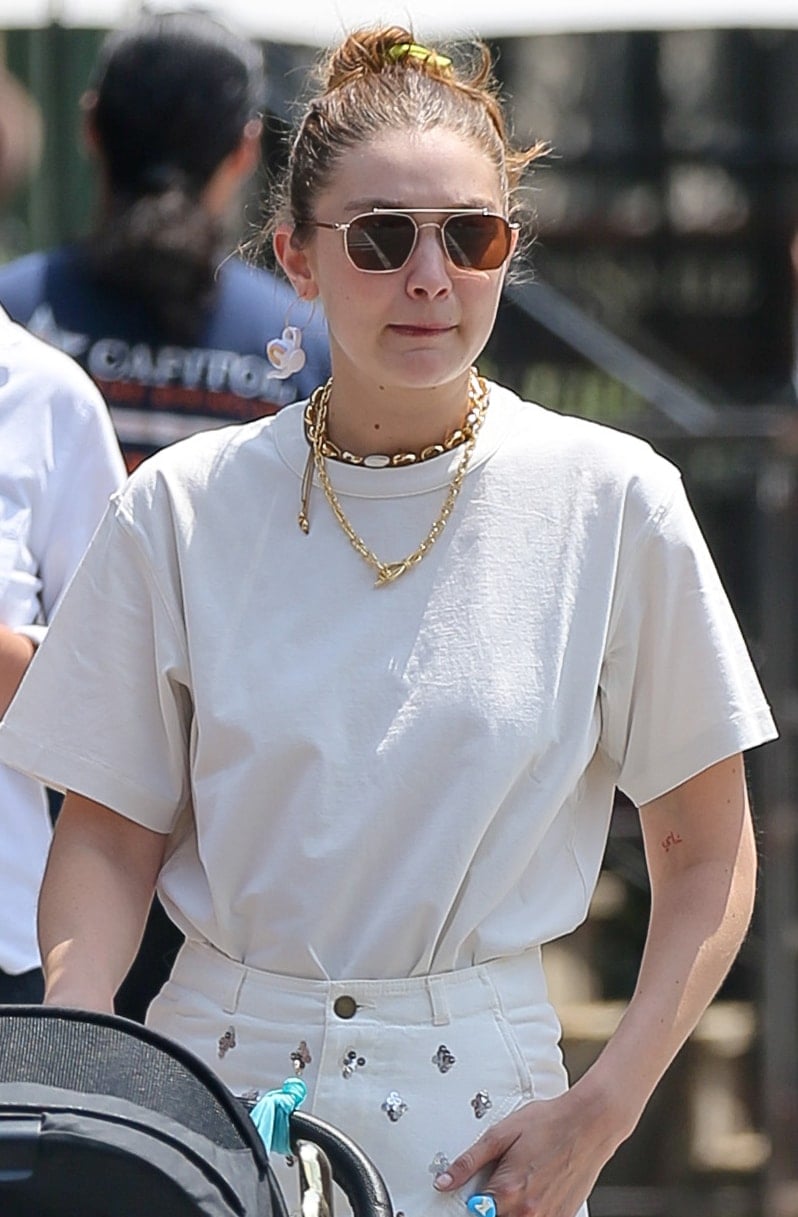 For the outing, Gigi Hadid looked effortlessly cool in her plain cream-colored tee, which she tucked into a pair of high-waisted white jeans with diamond-shaped silver sequins.