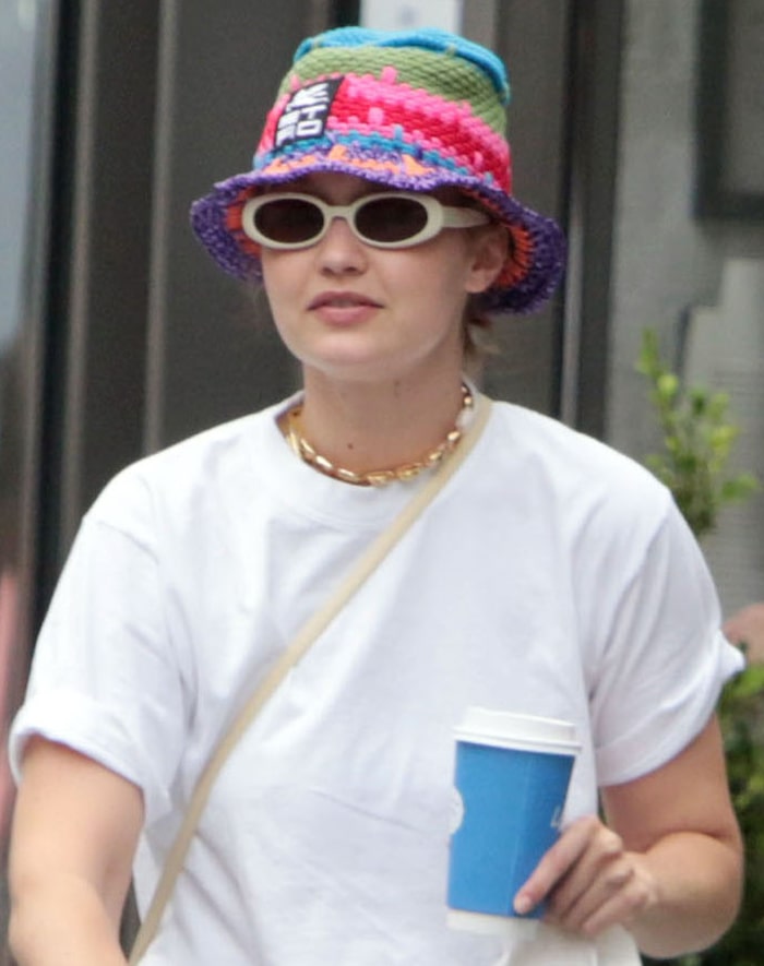 While she attempted to go low-key with a pair of $170 Dmy by Dmy Valentina oval sunglasses, Gigi remained recognizable in her multicolored crochet-knit bucket hat from Etro.