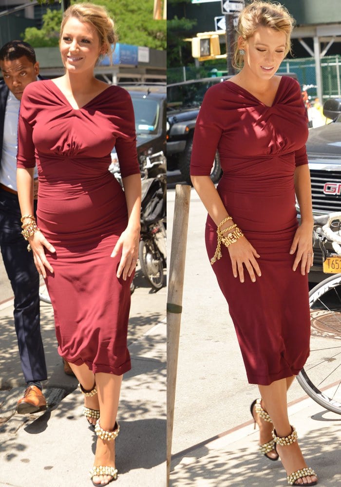 Blake chopped away at vegetables in a red dress by Oscar de la Renta, which showed off her growing baby bump. The actress slipped on a pair of crystal-encrusted earrings by Lorraine Schwartz, echoing them with the pearl-studded “Tudor Bal” sandals from Christian Louboutin.