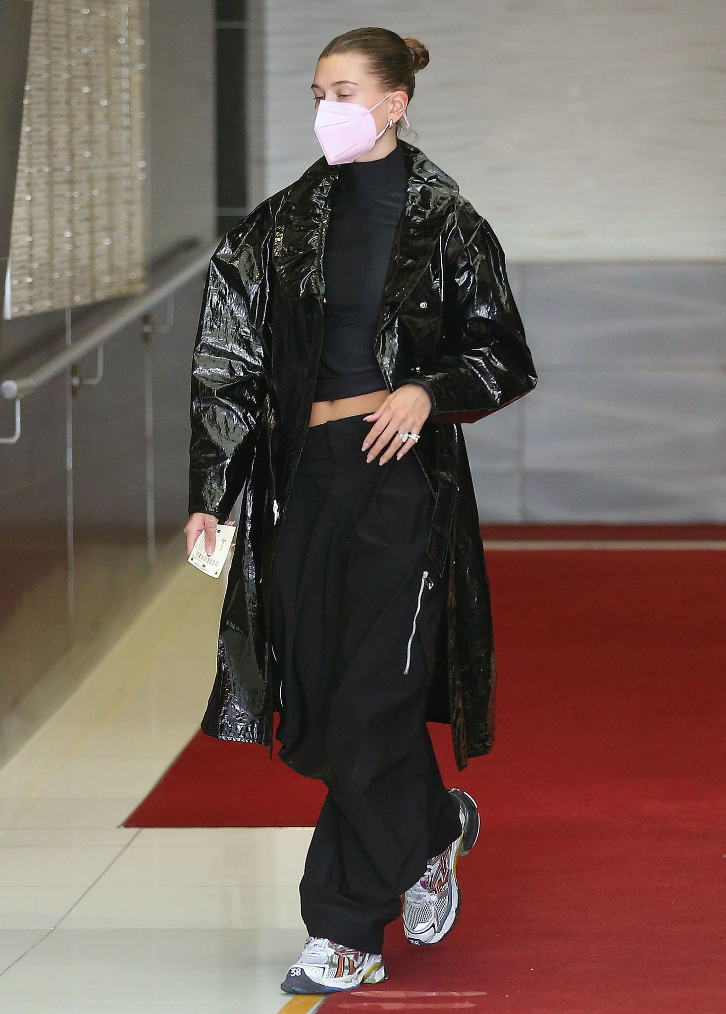 On Sunday that week, Hailey was pictured wearing her multicolored Balenciaga Runner sneakers with a Matrix-inspired all-black ensemble.