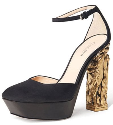 From the front, the shoes read almost like classic d’Orsay suede pumps, complete with a slim ankle strap and clean, sculpted lines. But the moment she turns, the mood shifts—the heels reveal a dramatic, gilded, sculptural block that either wins you over instantly or leaves you completely surprised.