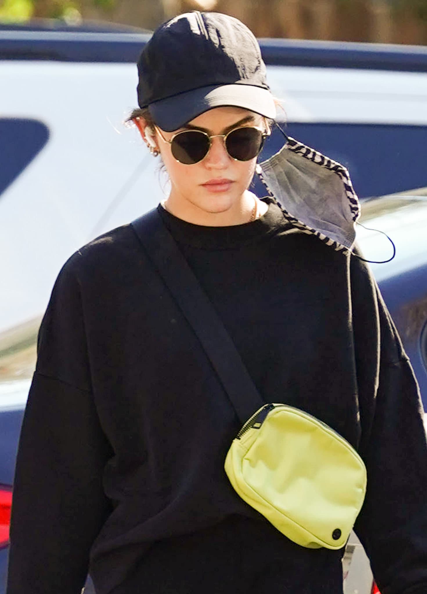 Lucy Hale adds a pop of neon yellow to her look with a Lululemon belt bag (Credit: Instar / WENN)