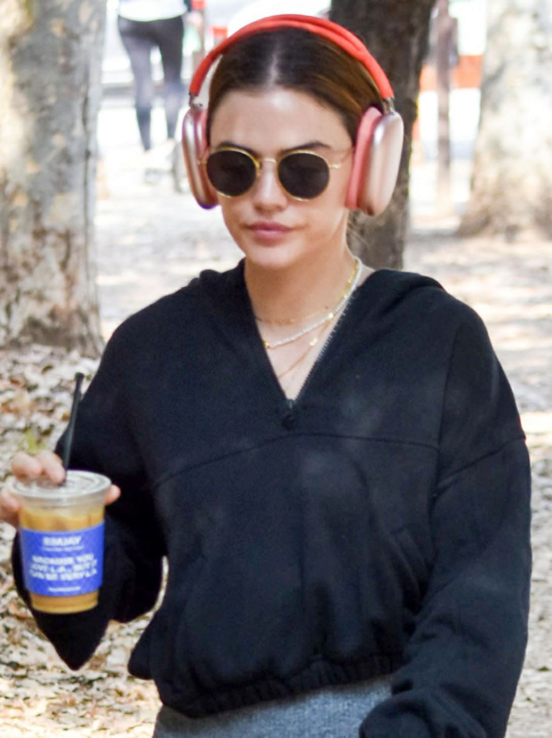 Lucy Hale goes hiking with headphones on (Credit: Instar / WENN)