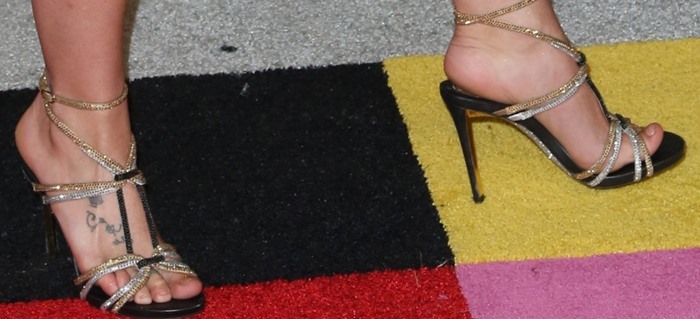 Britney styled her sheer-paneled frock with an adorable high pony and showed off her feet in a stunning pair of metallic “Arabesque” sandals from René Caovilla.