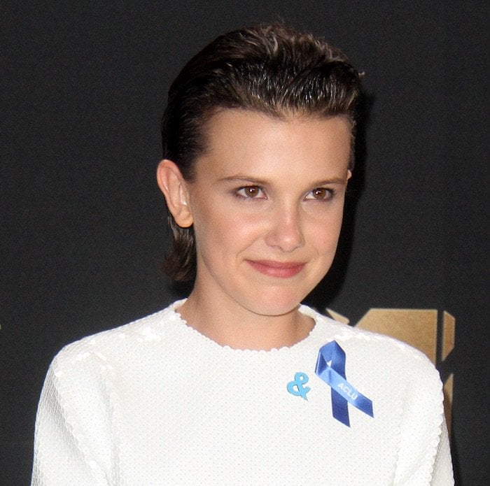 Millie’s short, brown hair was slicked back to bring out her gorgeous face, which had barely any makeup on. As if the teenager wasn’t lovable enough, she also showed her support for ACLU and GLAAD with ribbons pinned on her dress.