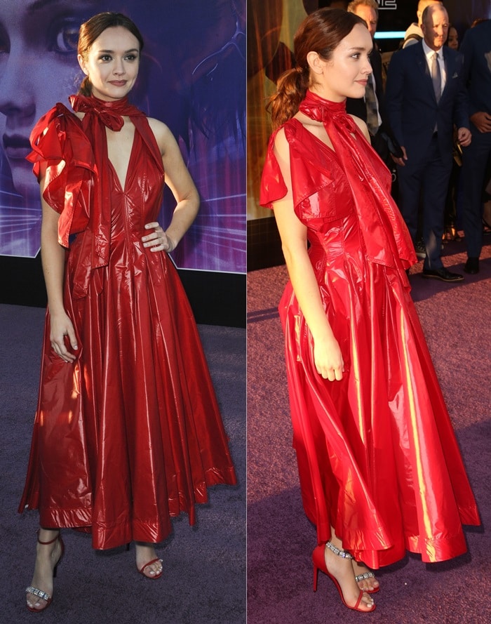 Olivia Cooke stunned in a red Calvin Klein 205W39NYC lightweight nylon dress ($4,900 at Neiman Marcus) and matching mismatched crystal-embellished strap “Camelle” sandals ($1,495 at Saks Fifth Avenue) at the premiere of her new movie “Ready Player One” at Dolby Theatre in Hollywood.