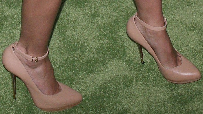 During a promotional event for The Other Woman, she paired a gray Victoria Beckham mini dress with white Saint Laurent “Paris” pumps, adding a modern edge to her ensemble. Her sleek choice of white pumps perfectly balanced elegance and sophistication.