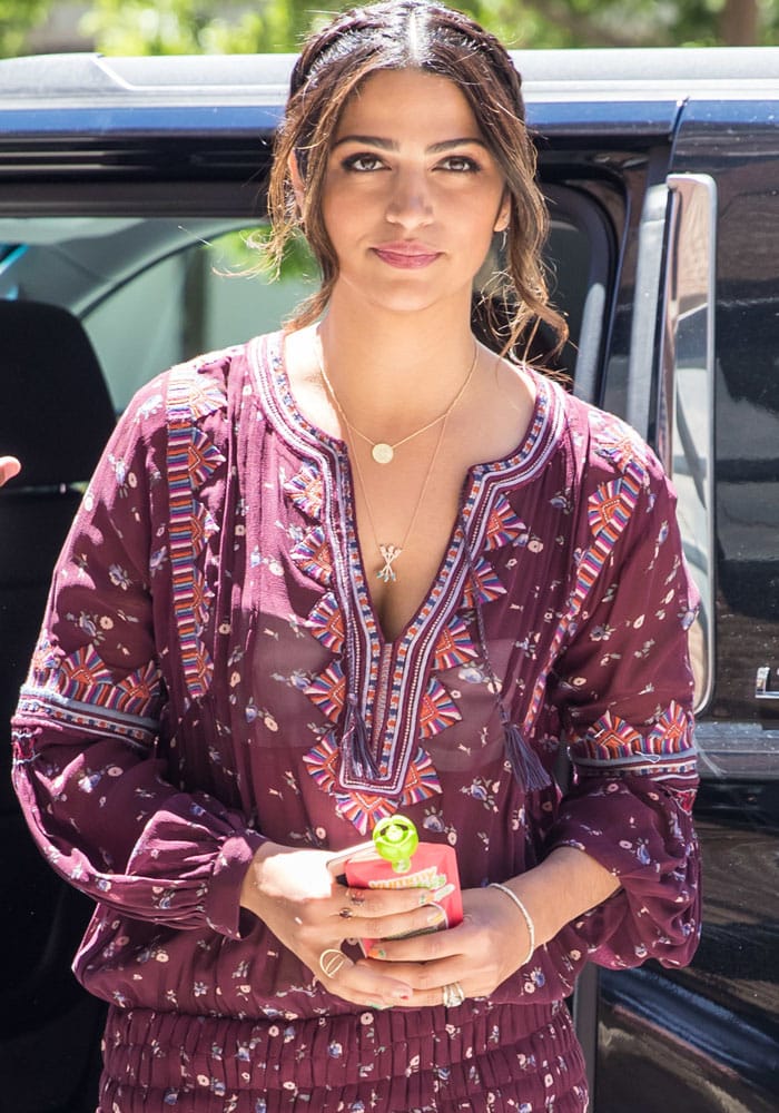 Camila started her day off in a boho chic getup, choosing a printed tunic as a base piece. She styled her top with a Jennifer Myer initial pendant necklace, the Meira T “Pave” diamond ear crawler and the Giuseppe Zanotti “Azalea” sandals in coral suede.
