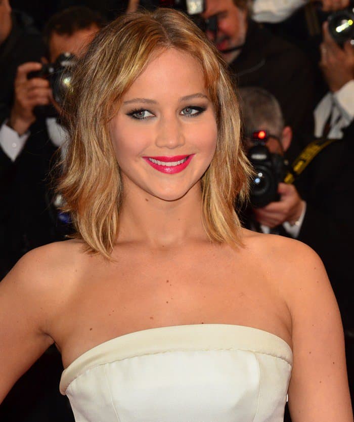 Jennifer Lawrence’s look was completed with a tousled center-parted hairstyle, Chopard jewelry, and a striking fuchsia pink lipstick (Credit: Palme 2013 / News Pictures / WENN)