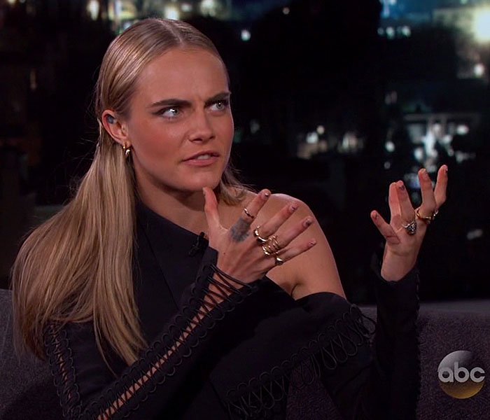Cara accessorized with a collection of gold rings and kept her makeup natural.