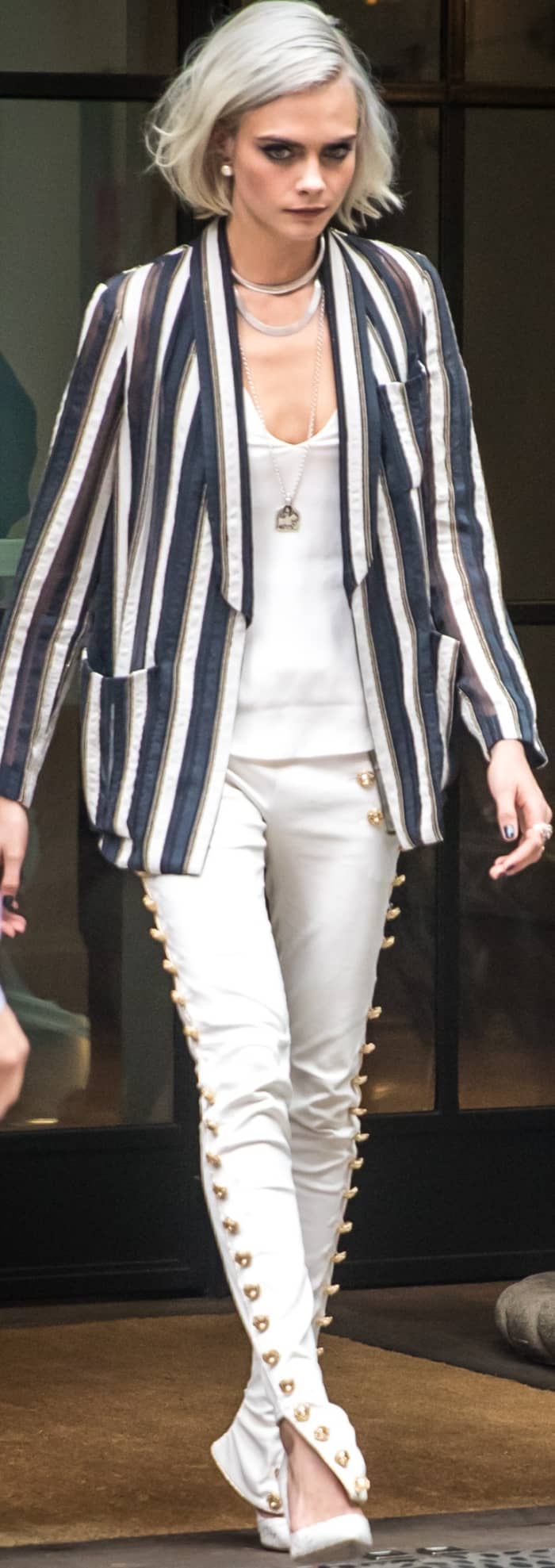Cara Delevingne served up her signature cool-girl style during a 2017 outing in New York City, turning heads as she stepped out of her hotel in an eye-catching all-white ensemble paired with a striped blazer.
