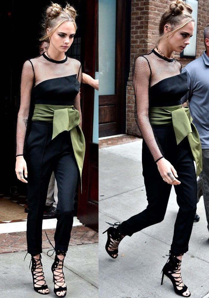 Cara wore her hair in two messy buns on top of her head, reminding us of Baby Spice. It also reminds us of Harley Quinn.