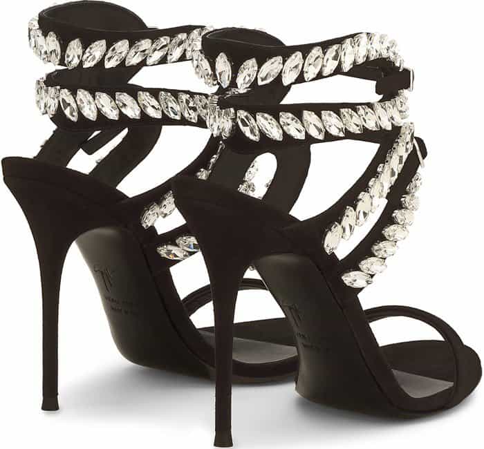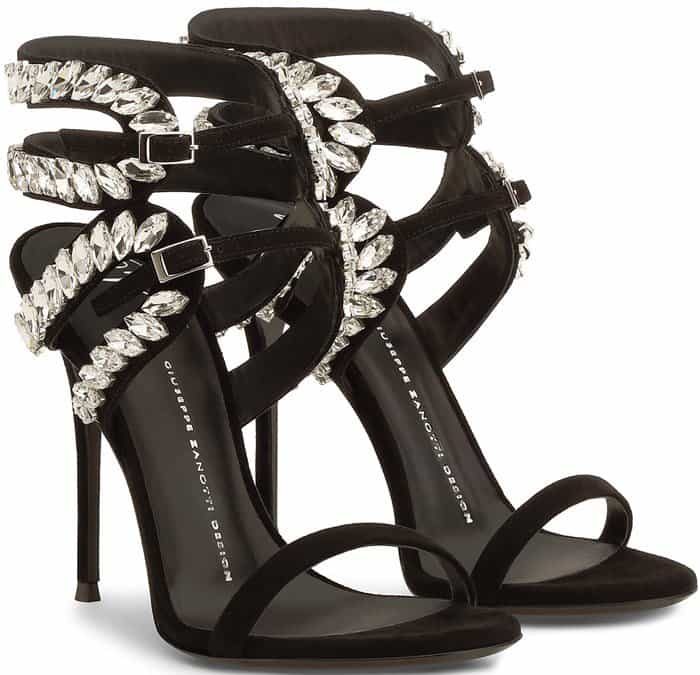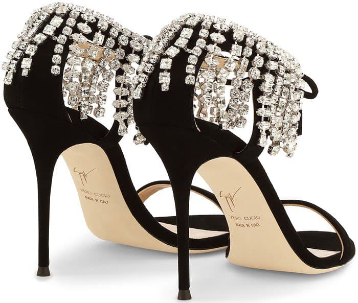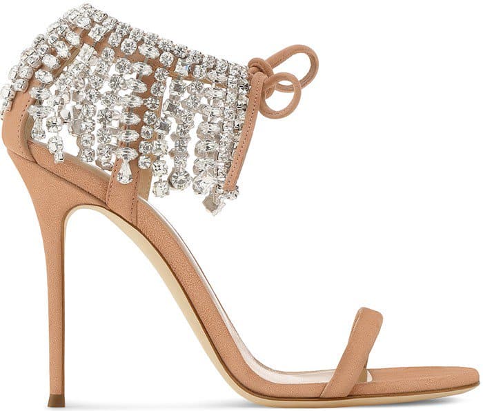 Proving that Giuseppe Zanotti “treats shoes like couture,” his ‘Carrie’ sandals are elegantly framed with crystal-studded fringing at the ankle. They’re crafted from antique-rose, black, and blue suede and set on a stiletto heel that’s fluted towards the base for stability.