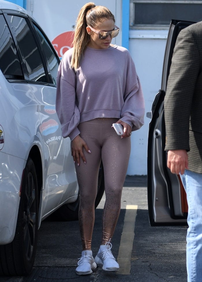 Earlier that year, Jennifer Lopez looked chic going to a gym in Miami. She flaunted her legs in Beyond Yoga’s Alloy Ombre leggings with rose-gold ombré detailing, paired with a crewneck sweatshirt, Quay Australia’s Hidden Hills sunglasses, and her favorite Nike Air Presto sneakers in white.